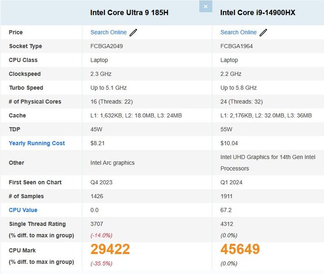 La différence de performance entre les 2 CPU vient de la conso du 14900HX qui peut être jusqu'à 50% plus élevée que celle du 185H.